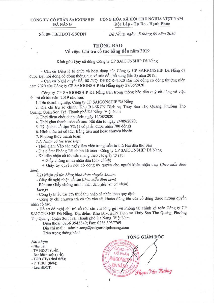 Thông báo chi trả cổ tức bằng tiền mặt năm 2019 cho quý cổ đông.