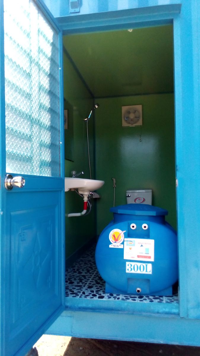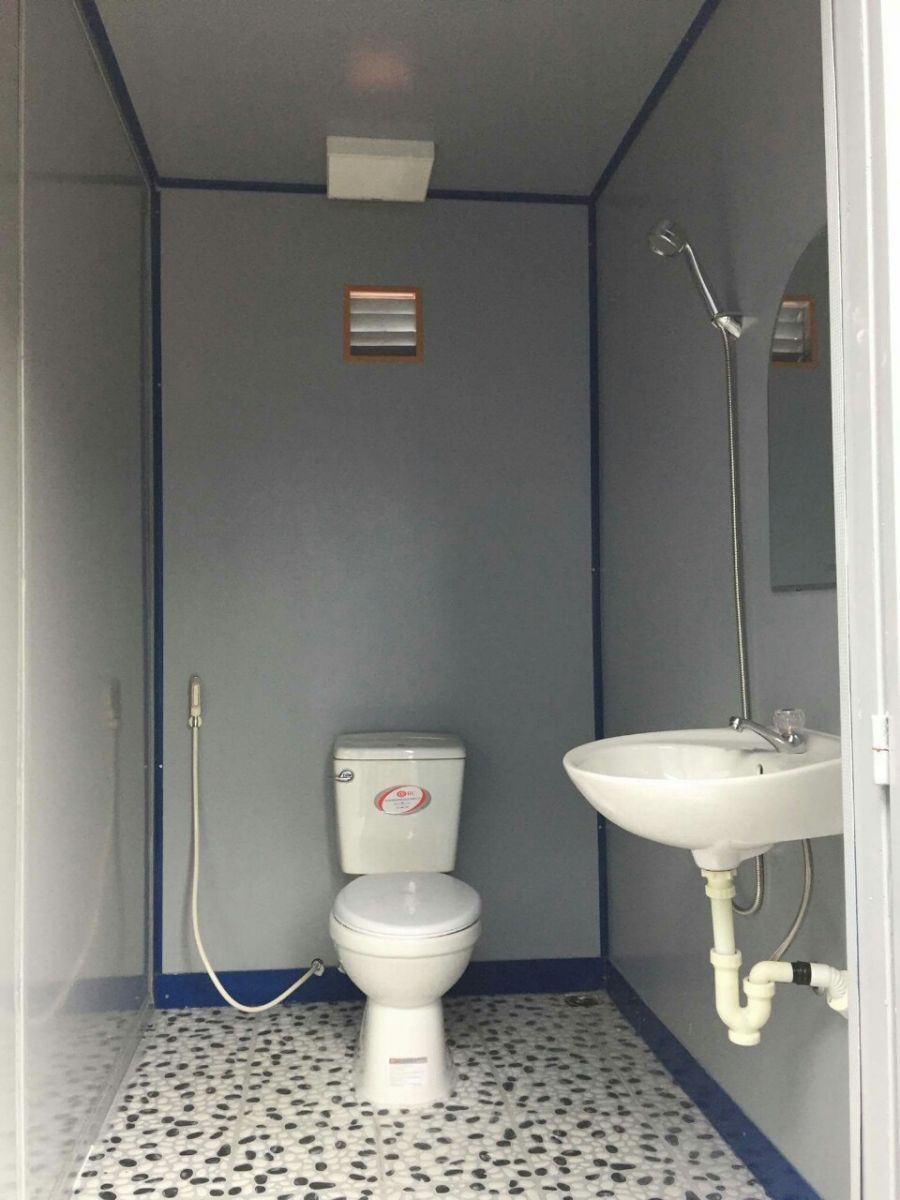 + 01 cửa vào bằng sắt nằm bên ngoài cont, phần trên lắp gương. Mỗi phòng có 01 cie, 01 vòi xịt và 0,1 vòi xả, 01 giỏ đựng giấy, 01 Lavabo rửa tay, 01 gương soi, kệ đựng xà phòng; 01 bộ đèn Compact.